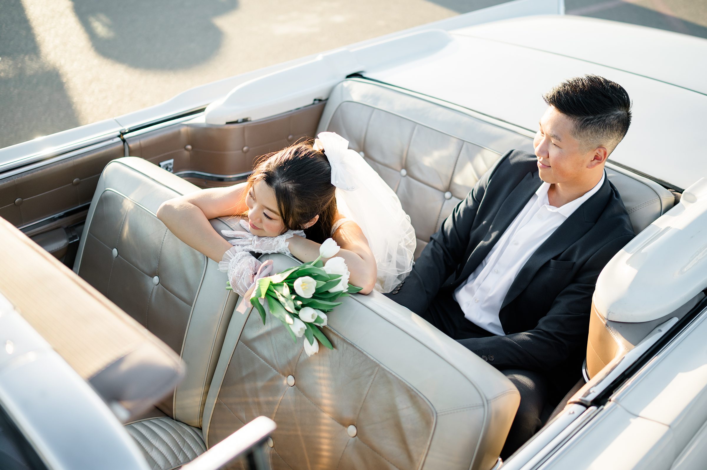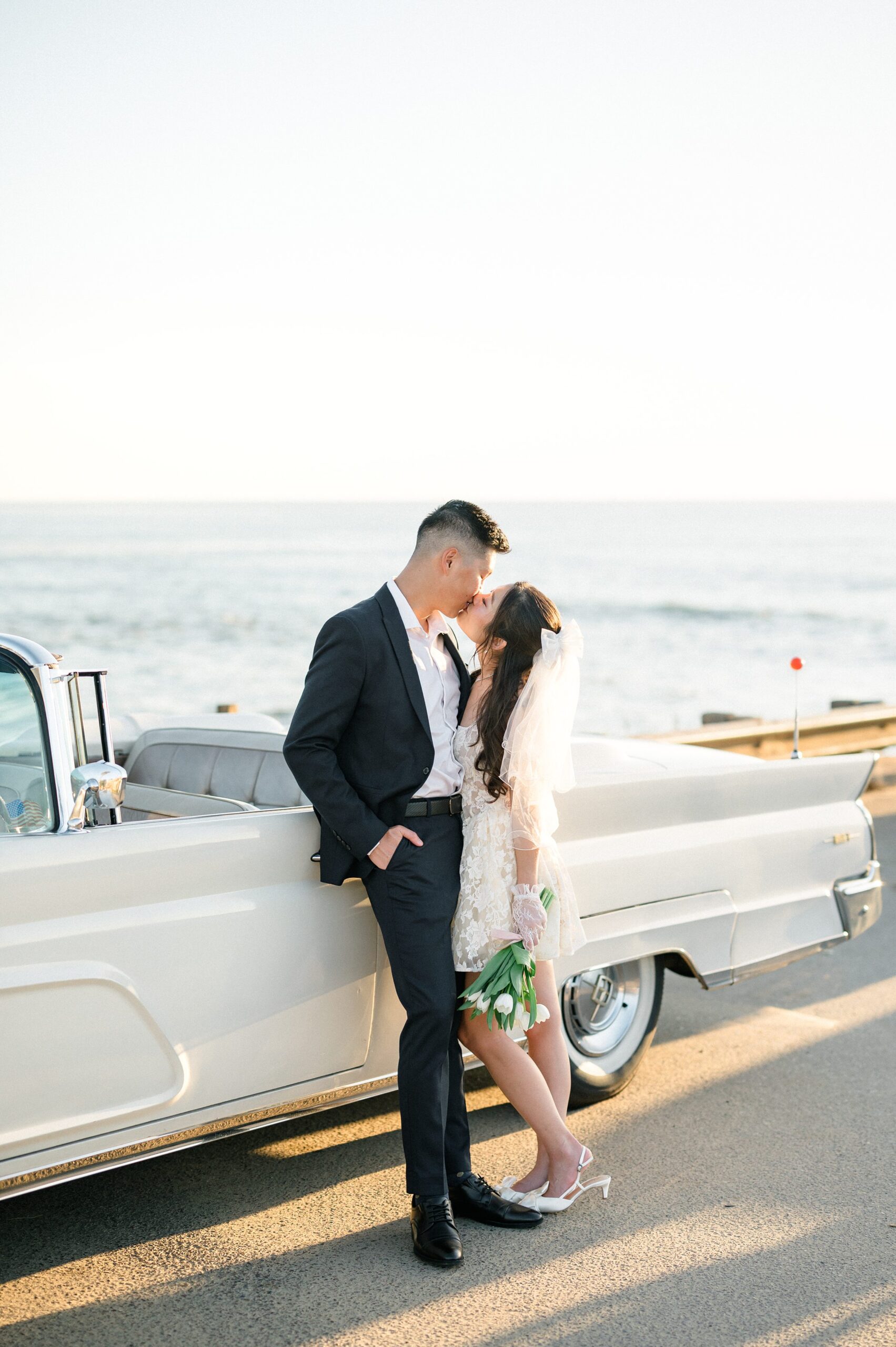After revisiting those early memories, we made our way down to the beach for the second half of their session, and it was pure magic. The soft San Diego light, the ocean breeze, and a classic white car waiting by the shore created the dreamiest scene. Angela and Anthony looked so chic against the coastal backdrop, and the entire evening unfolded like a quiet love story filled with warmth, ease, and genuine joy.